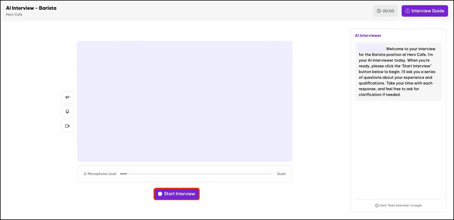 - Timer: Once the interview starts, a timer in the top-right corner shows how long you've been going