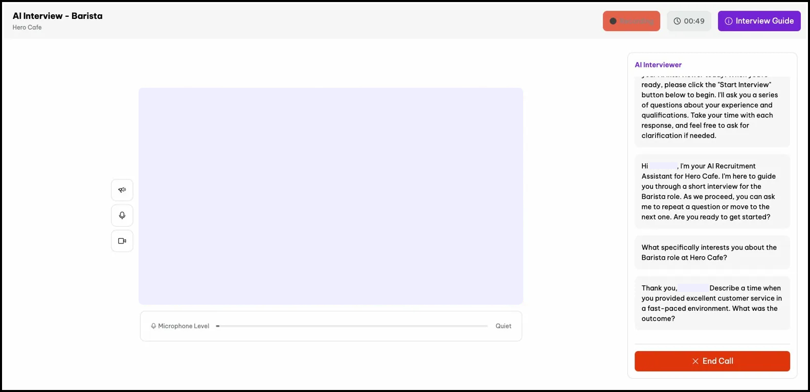 Once the conversation is complete, click the red End Call button at the bottom of the AI Interviewer panel. Your recording is automatically saved and submitted to the employer — there is nothing further you need to do.