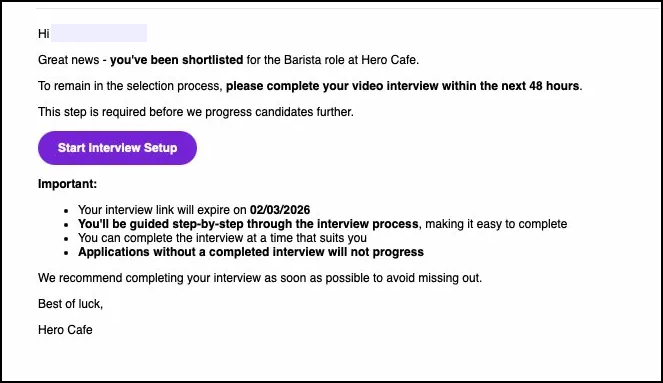 You'll receive an email from the employer letting you know you've been shortlisted and inviting you to complete a video interview. The email will include: