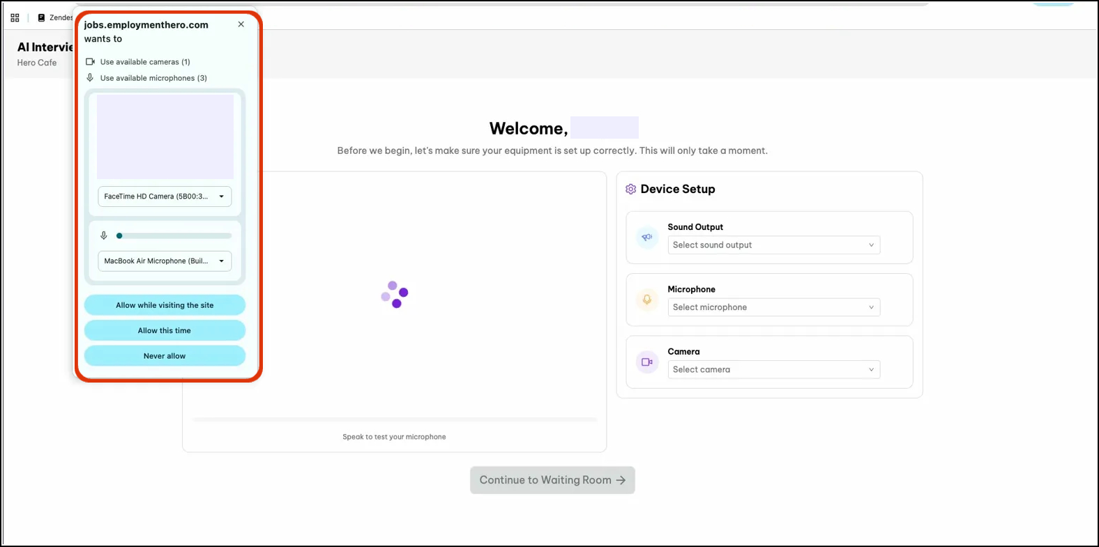 - Grant browser permissions: Your browser will show a popup asking permission to use your camera and microphone. Select Allow while visiting the site or Allow this time. Without these permissions the interview cannot proceed.