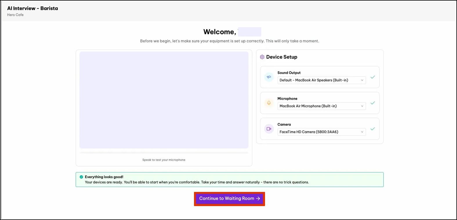 Wait for the green confirmation: Once all three devices are verified, you'll see a "Everything looks good!" message at the bottom of the screen with a green tick, and the Continue to Waiting Room button will become active.