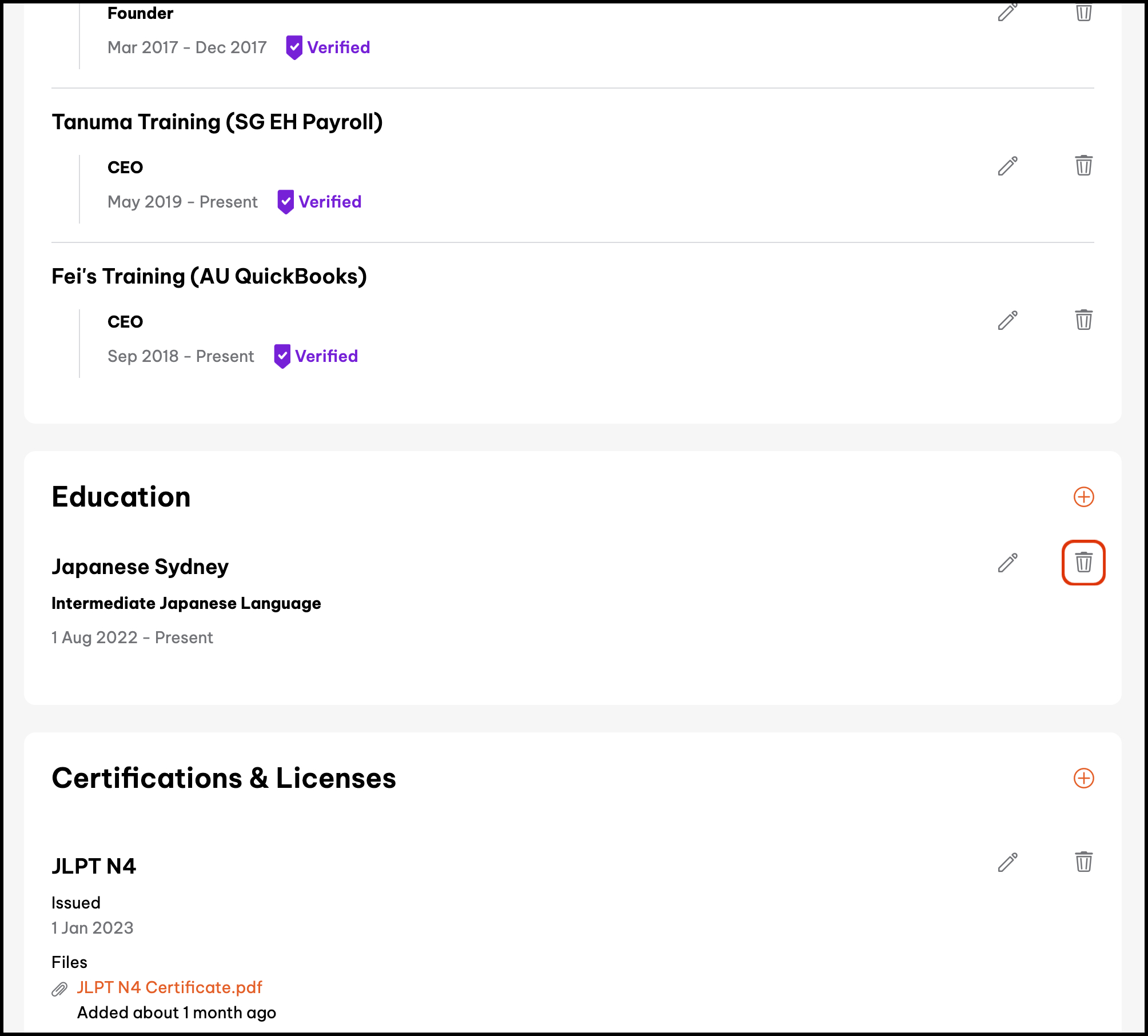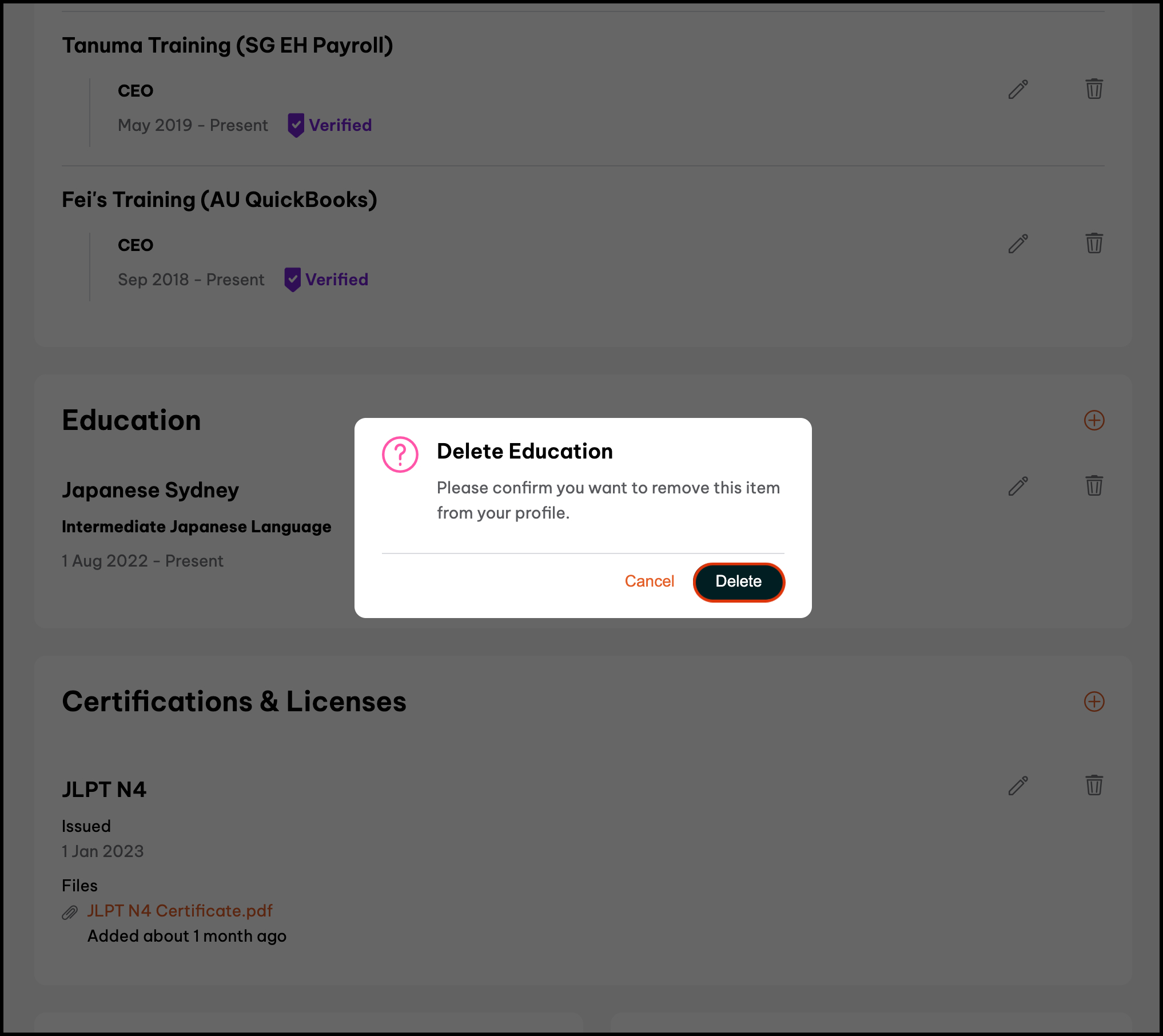- Click the button next to the education you wish to delete.